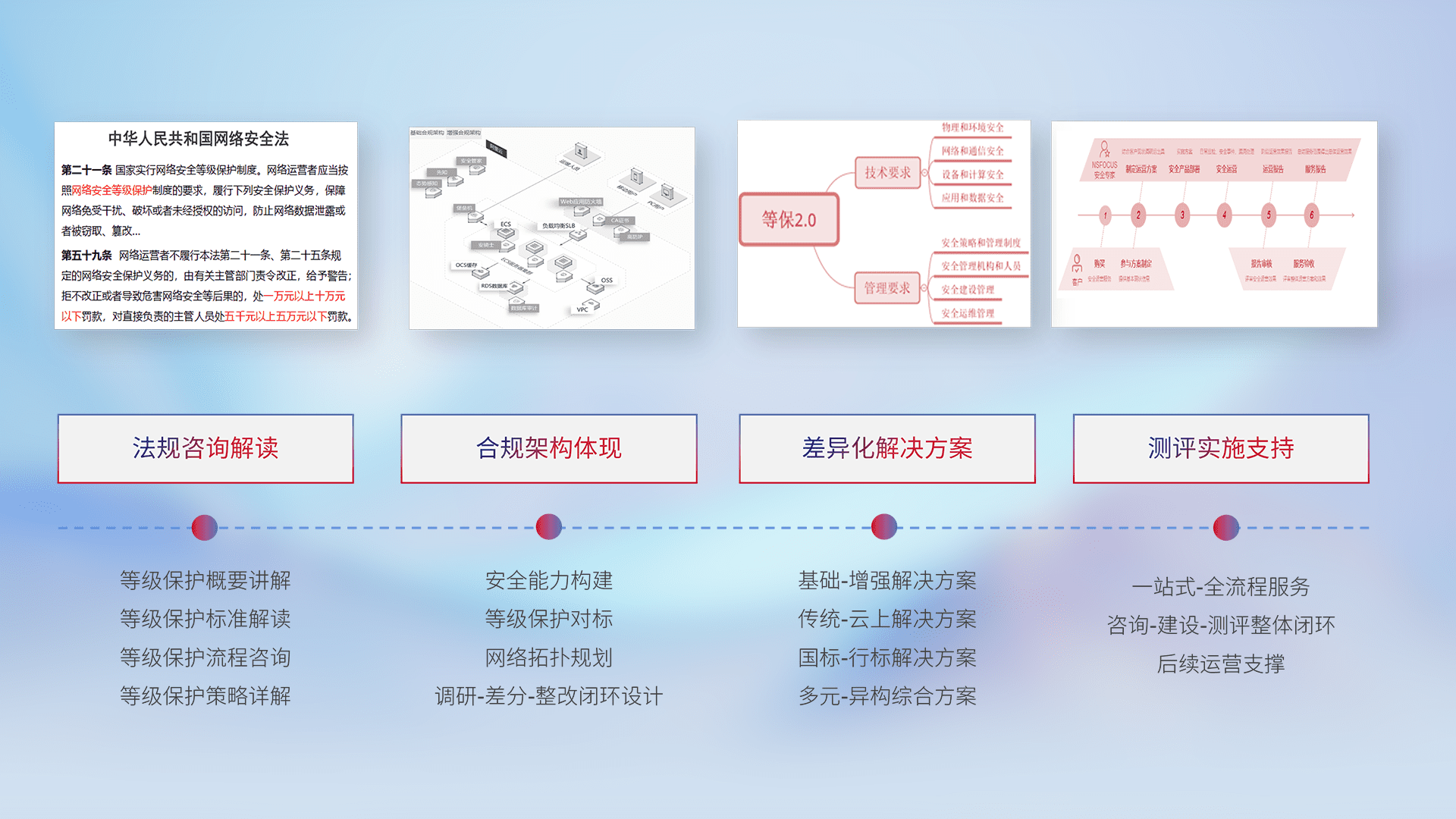 通过专业的法律咨询解读、、、合规架构体现、、差异化解决方案、、测试实施支持等服务,,为客户量身打造等保合规体系。。